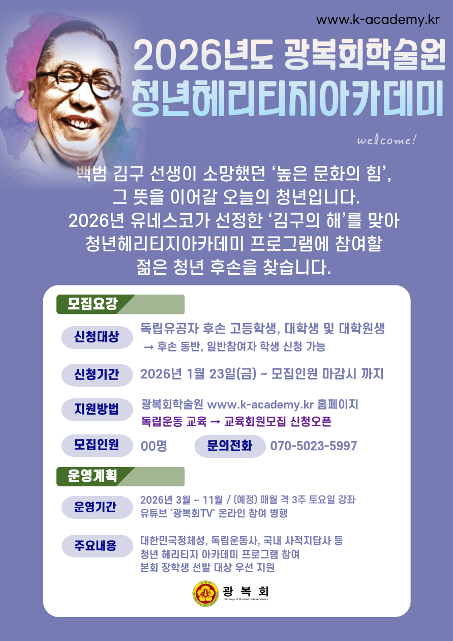 유네스코가 주목한 2026년 '김구의 해'. 광복회 '청년 헤리티지 아카데미'가 독립영웅의 젊은 후손을 모집합니다.